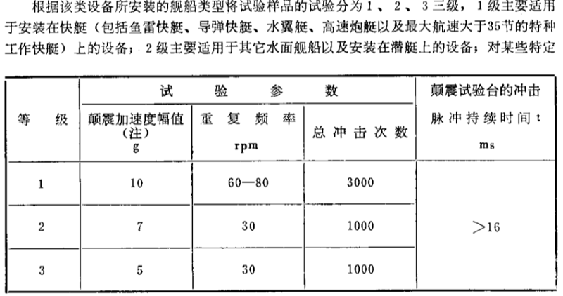 “GJB 4.8-1983 舰船电子设备环境试验 颠震试验”,对于舰船装备的颠震试验进行了阐述,颠震试验主要目的是评定舰船装备在舰船作战、航行时由波浪引起的重复性低强度冲击环境的装备工作适应性和结构完好性。试验等级如下图3所示,主要引用参数2级,即7g,16ms,30rpm,冲击次数1000次。