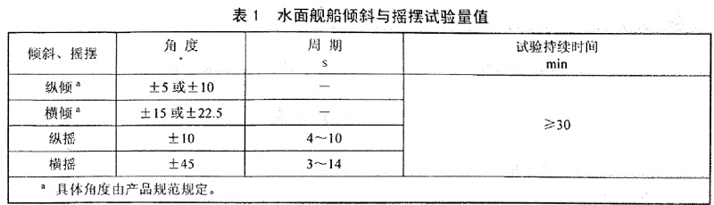 “GJB 150.23A-2009军用装备实验室环境试验方法 倾斜和摇摆试验”,阐述了倾斜摇摆试验的目的时 验证装备结构完好性,工作正常能力。水面舰船的摇摆参数如下图4所示,试验案例如图5所示。