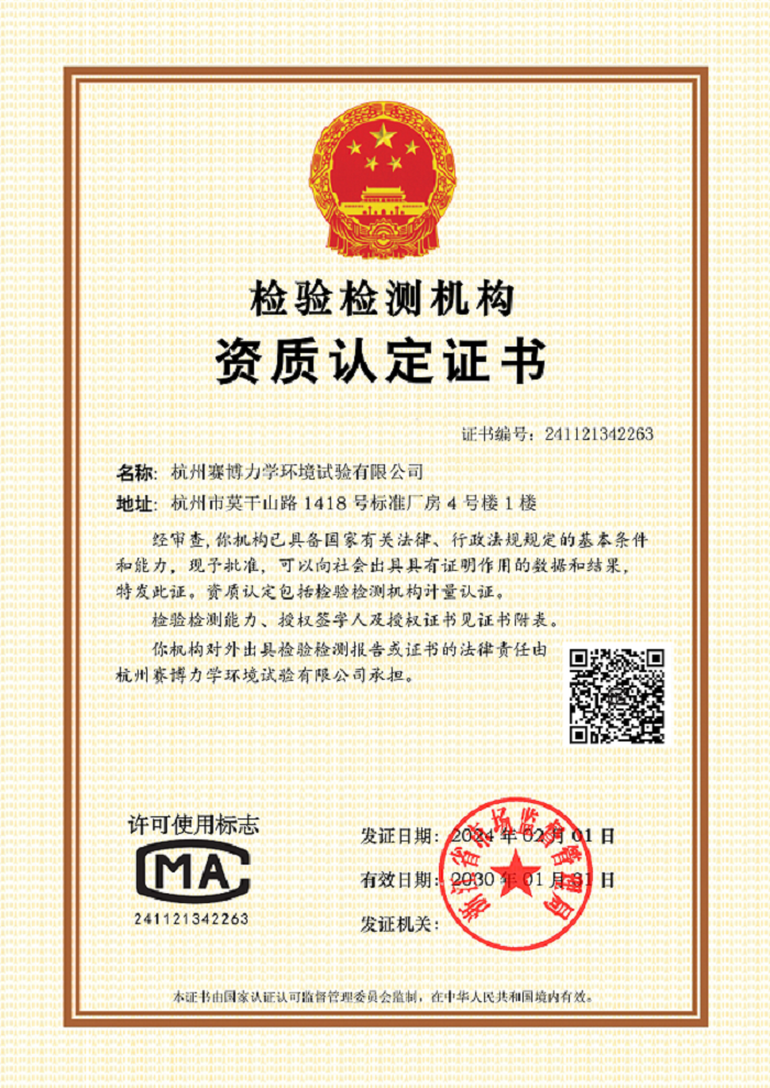 CMA(China Inspection Body and Laboratory Mandatory Approval),中国计量认证的简称,是根据中华人民共和国计量法的规定,由省级以上人民政府计量行政部门对检测机构的检测能力及可靠性进行的一种全面的认证及评价。只有取得计量认证合格证书的检测机构,才能够从事检测检验工作,并允许其在检验报告上使用CMA标记。有CMA标记的检验报告可用于产品质量评价、成果及司法鉴定,具有法律效力。